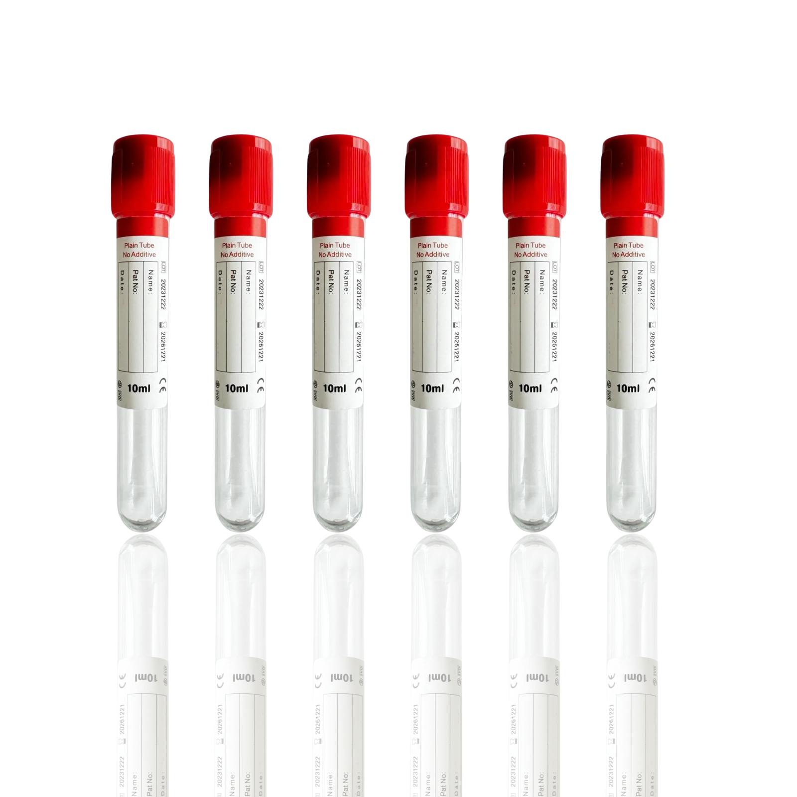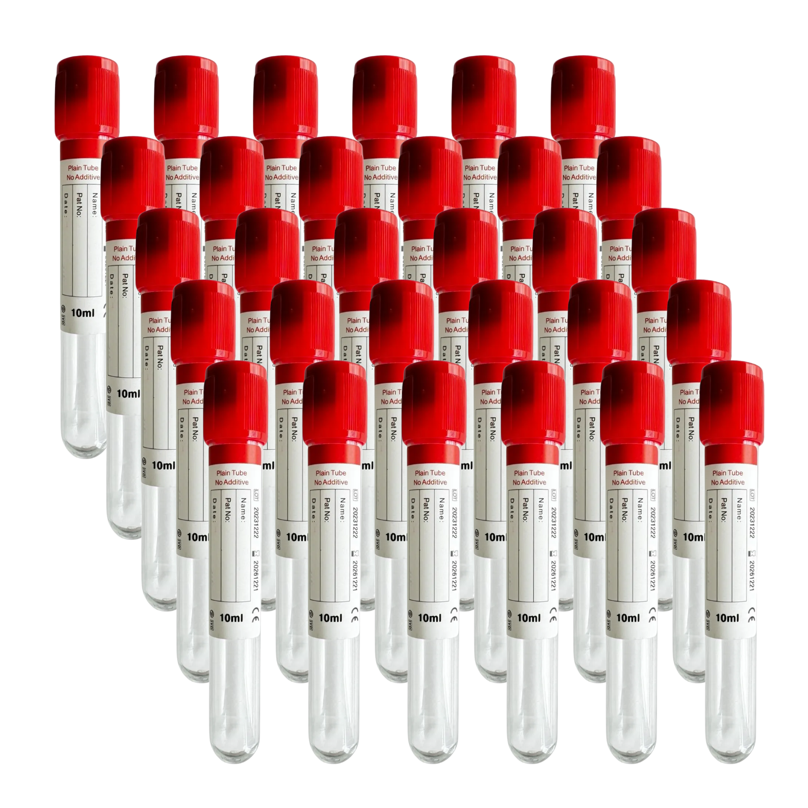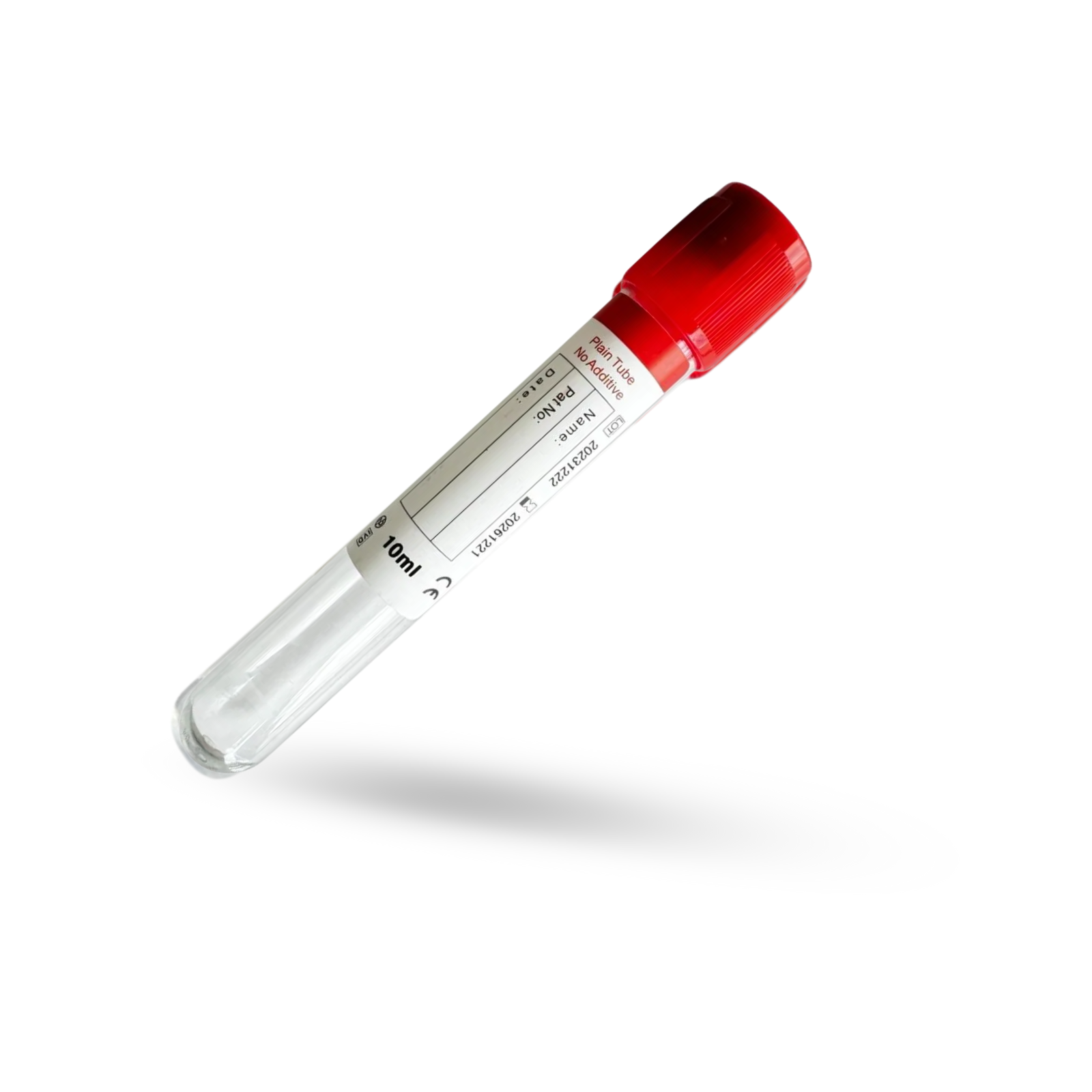 This 10mL Vacuum Blood Collection Tube with a red top is a plain, additive-free tube made of durable PET plastic. Ideal for serum collection, it allows blood to clot naturally before centrifugation. These tubes are vacuum-sealed and EO sterilized to ensure sample integrity and safety for both patients and healthcare professionals, used in clinical chemistry, serology, and routine laboratory testing.