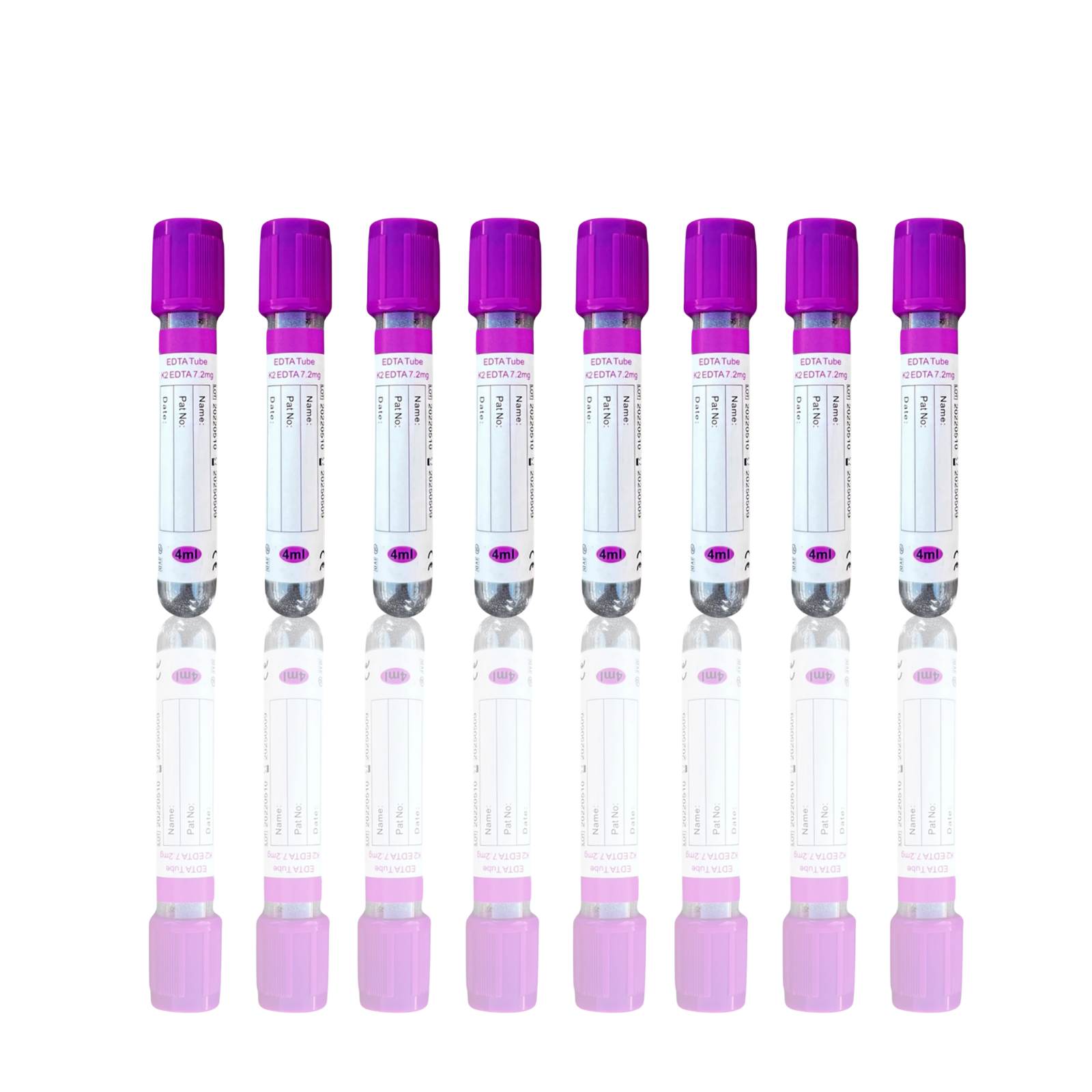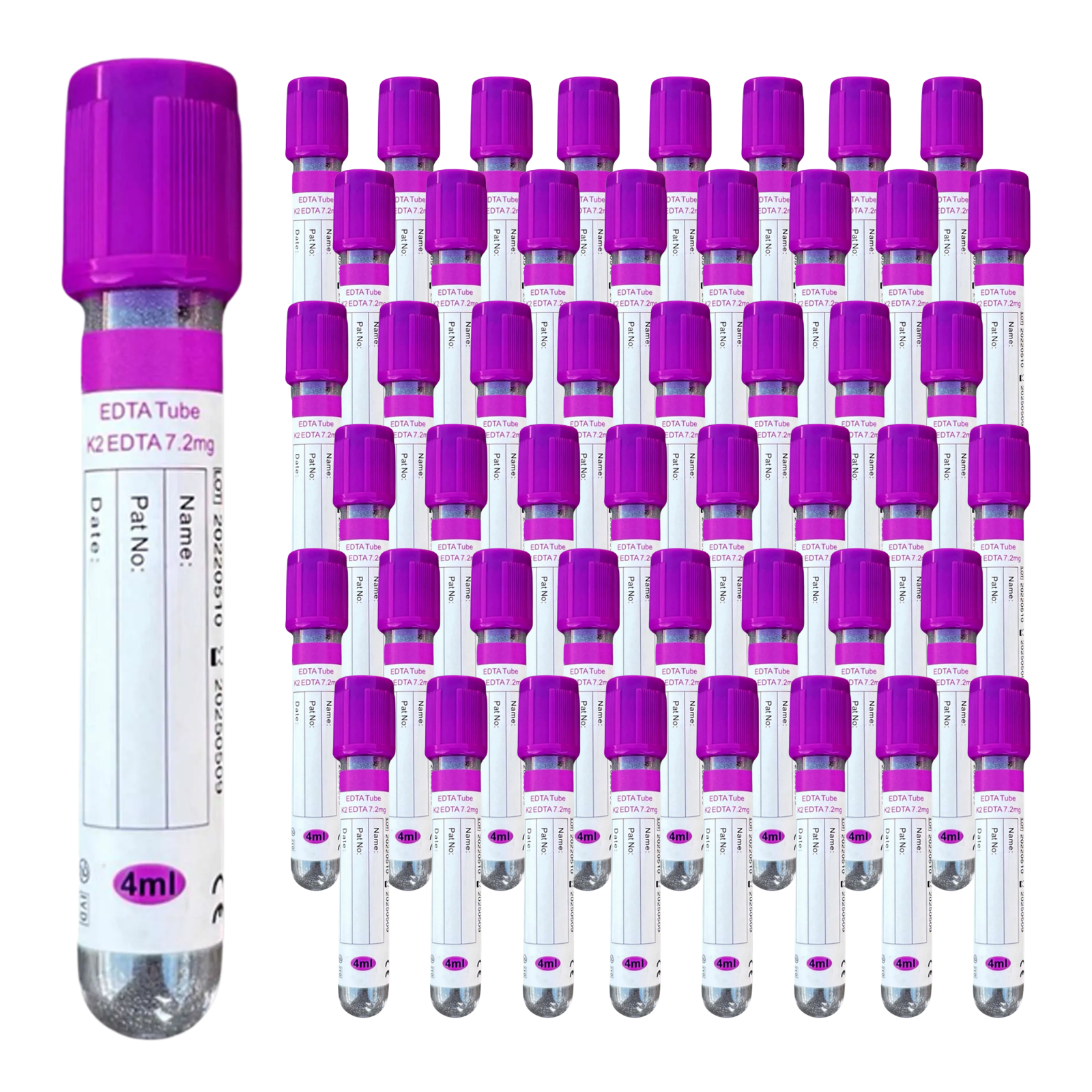 This 4 mL Vacuum Blood Collection Tube contains K2 EDTA (dipotassium ethylenediaminetetraacetic acid) as an anticoagulant, used primarily for hematology testing. The EDTA binds calcium in the blood, preventing clotting and preserving cell morphology. The purple (lavender) cap is universally recognized for blood cell analysis in clinical laboratories.